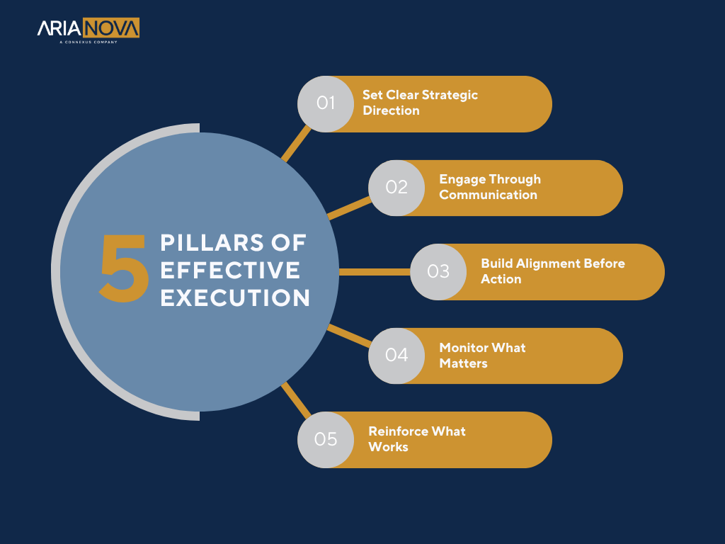 Execution thrives not just on effort, but on structure. The most effective organizations build the conditions for execution through clarity, alignment, and reinforcement. These five pillars help ensure that strategy moves from intention to sustained results: